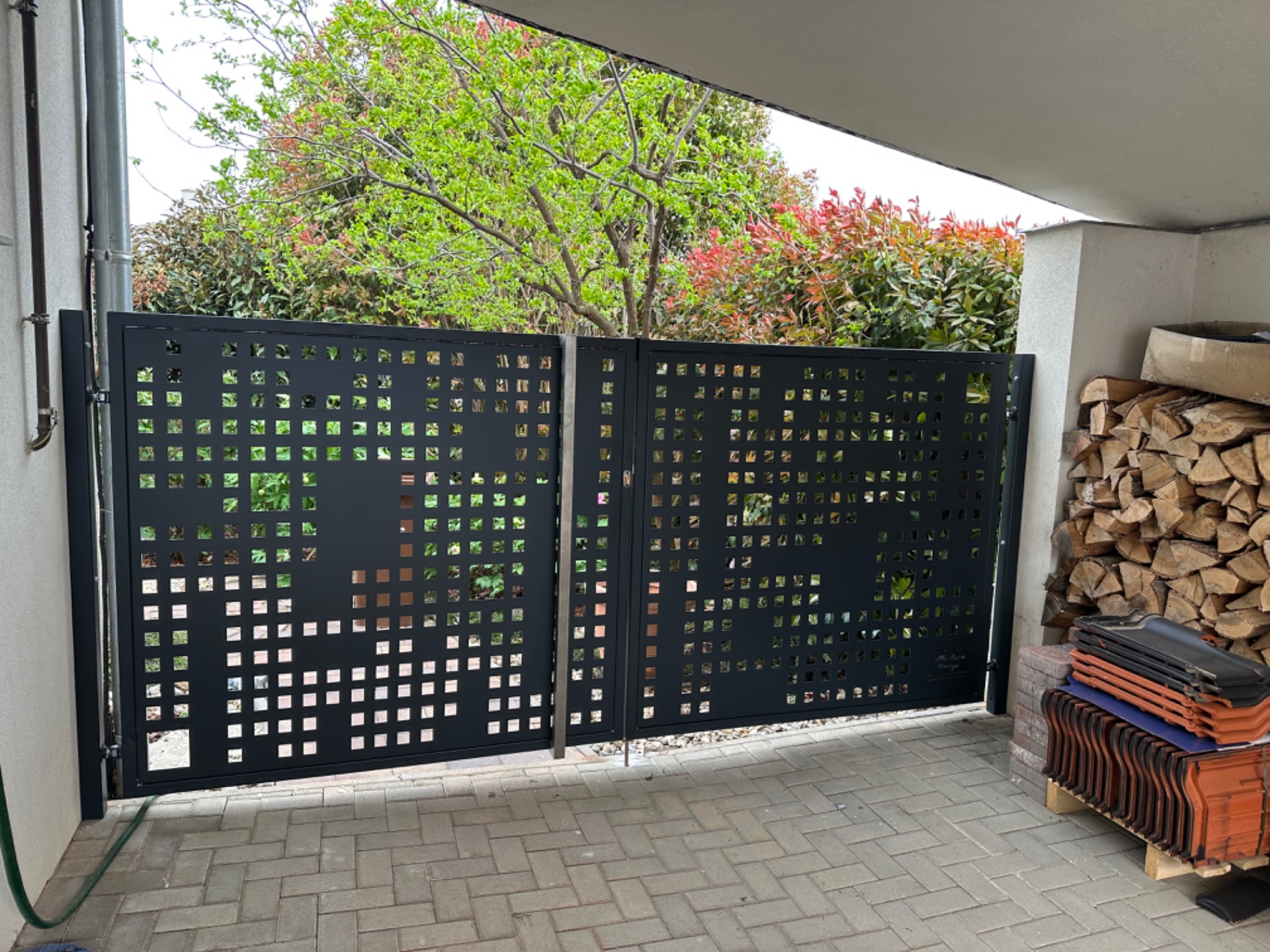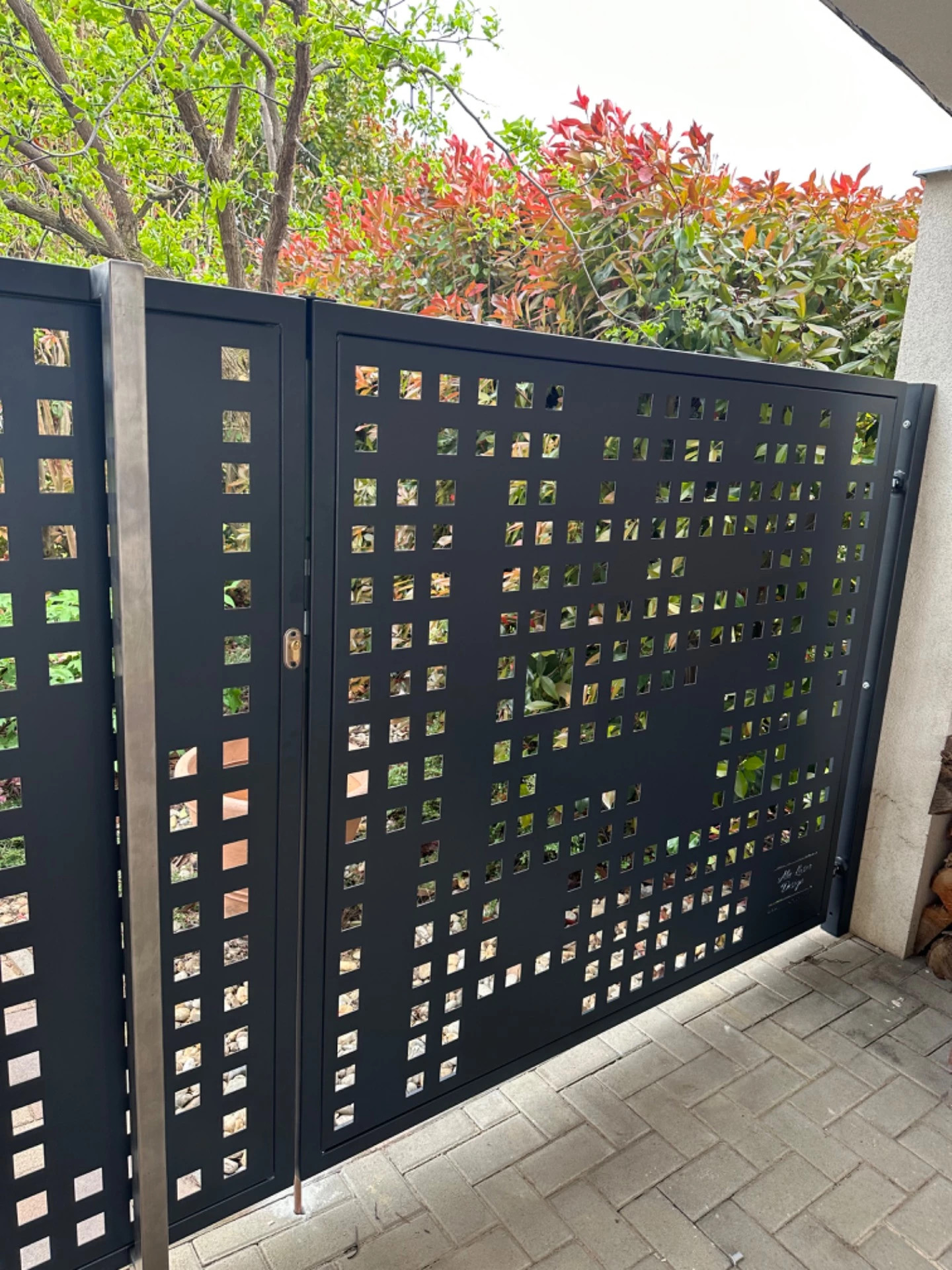 A lézervágott alumínium panelekkel készült kétszárnyú kapu ideális választás családi házakhozés ipari környezetbe egyaránt. A hagyományos nyitásmódot ötvözi a modern designnal, mikozben tartós, időtálló és teljes mértékben egyedileg gyártható