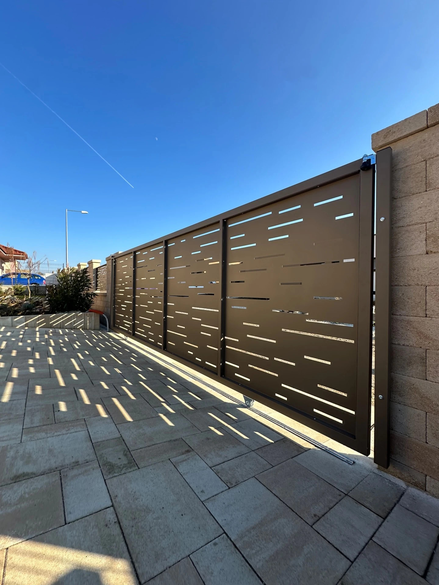Modern, tartós és látványos megoldás akár 7m-es nyílásokhoz. A tolókapu lézervágott alumínium panelekkel készül, pontos méretre gyártva, a helyszíni adottságokhoz könnyen igazítva.