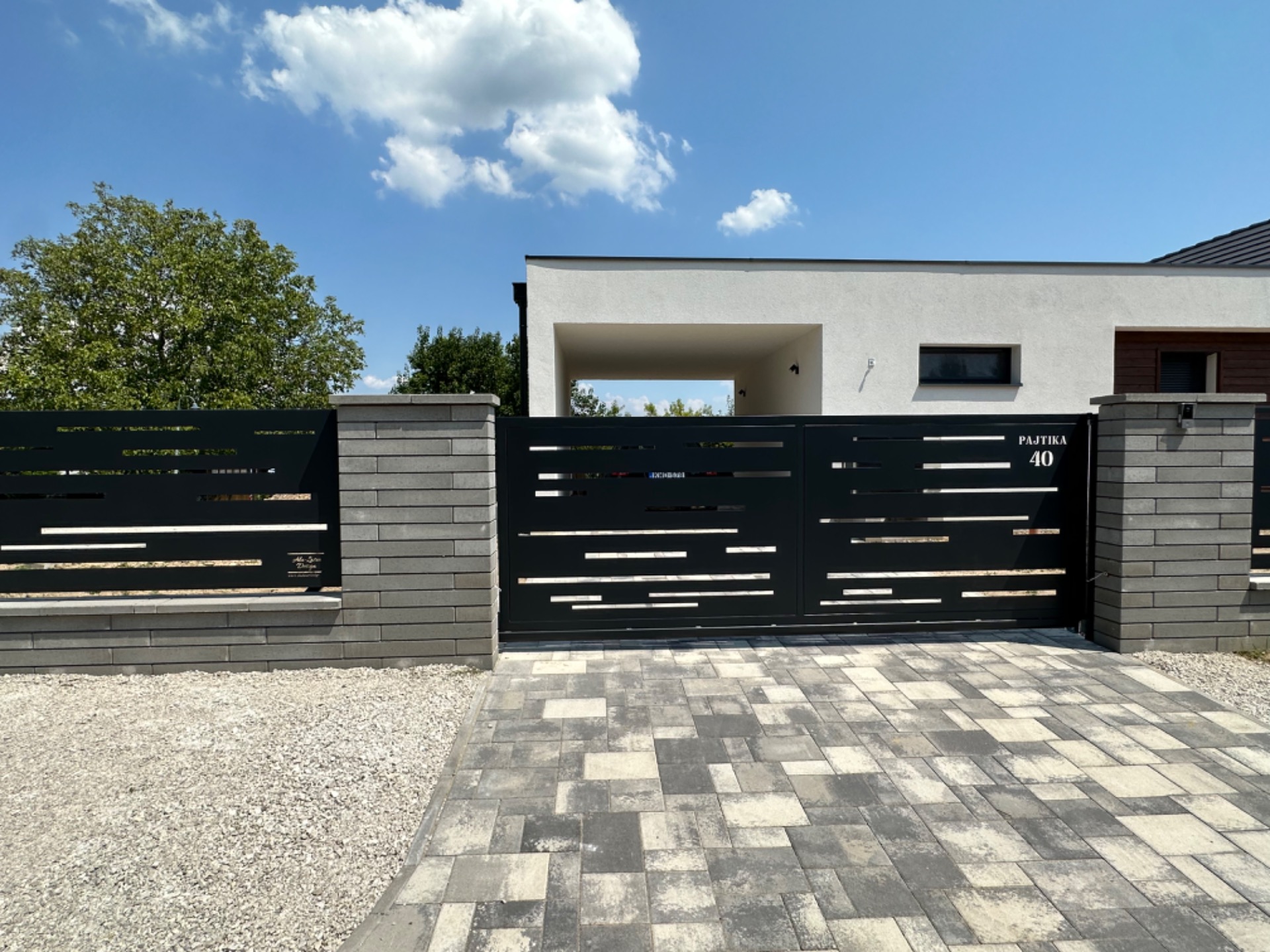 Modern megjelenésű, talajhoz nem rögzített, úszó kivitelű kapu, amely ideális választás egyenetlen burkolat, lejtős bejáró vagy nagyobb nyílás esetén. A lézervágott alumínium panelek elegáns megjelenést és hosszú élettartamot biztosítanak.